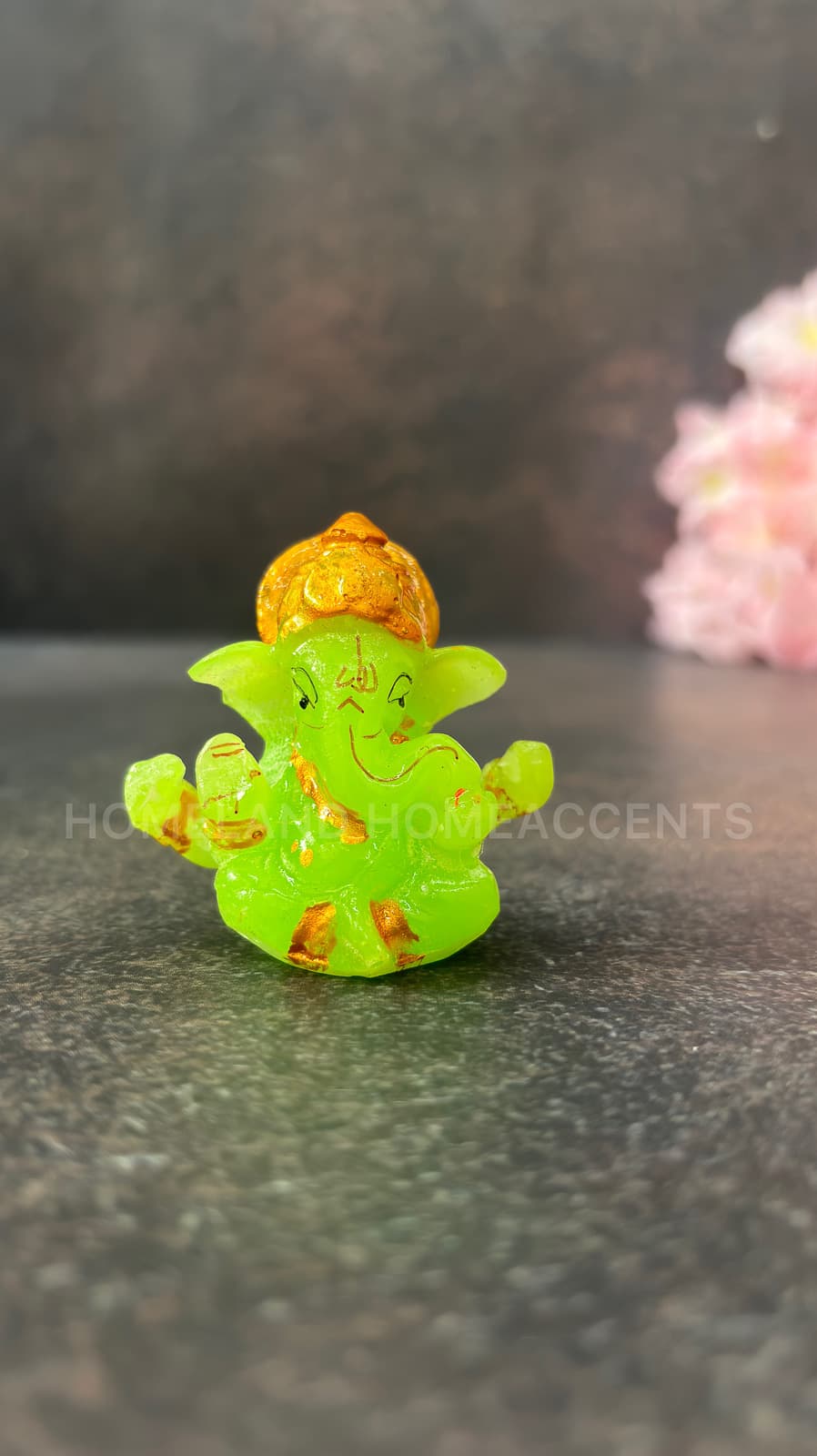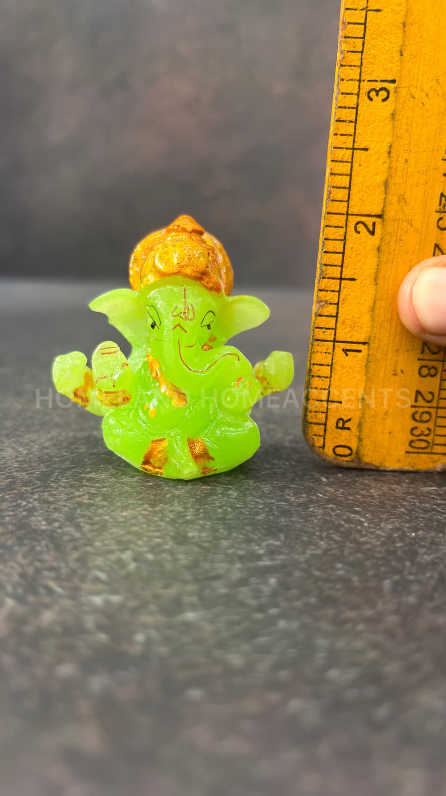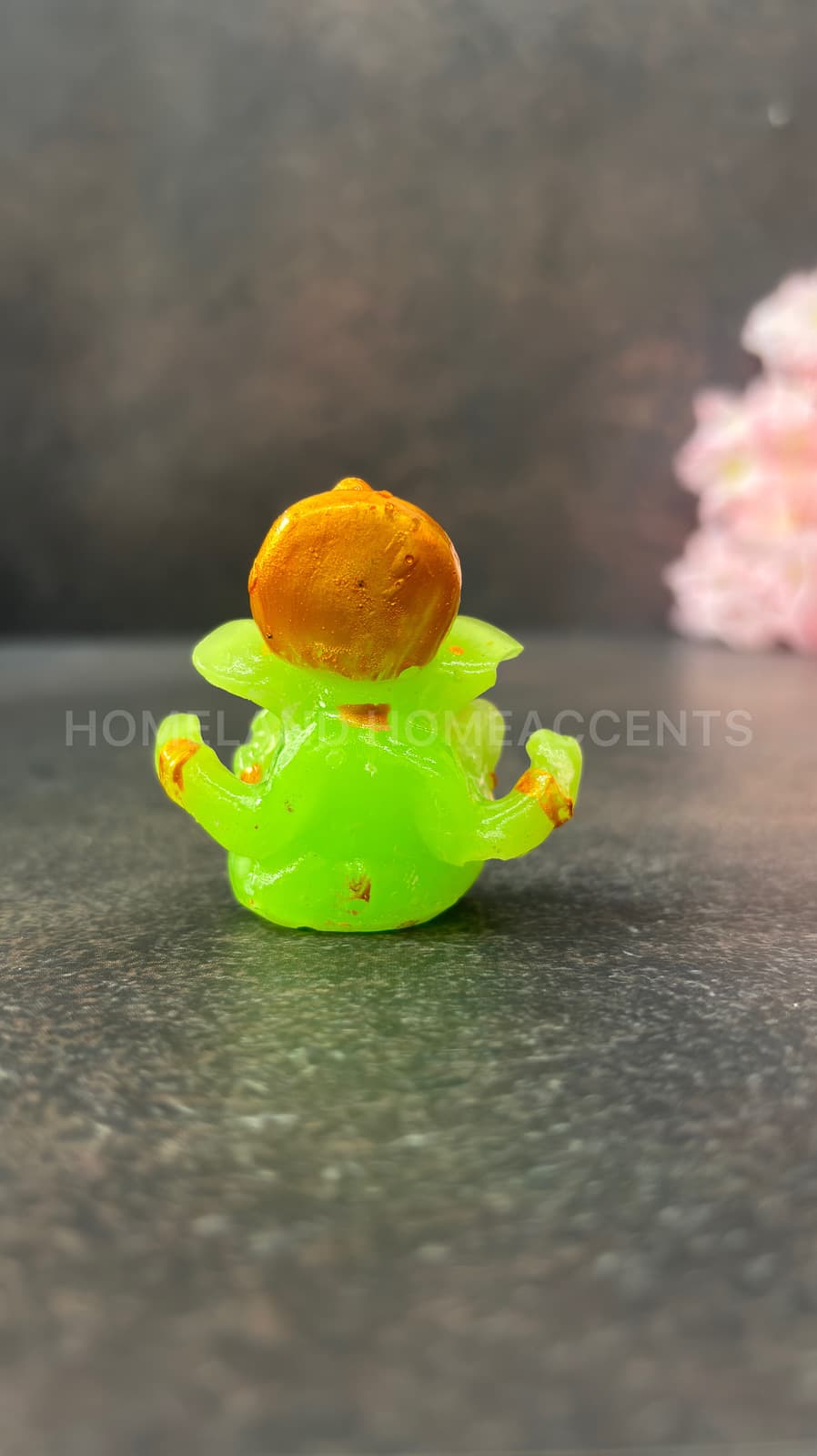 This vibrant Bright Green Ganesha Idol is crafted from a premium blend of radium and resin, giving it a glowing effect under dim light and a smooth, polished finish. Adorned with intricate golden detailing, this figurine portrays Lord Ganesha in a seated pose, symbolizing wisdom, prosperity, and good fortune. Its compact size and unique material make it an eye-catching decorative piece.
