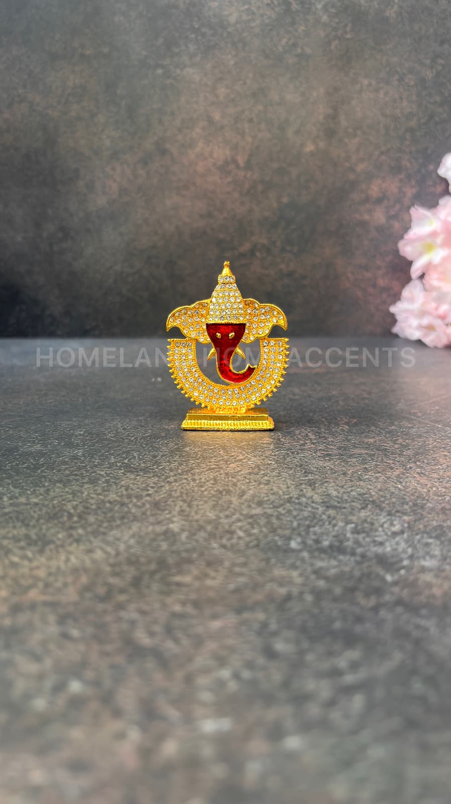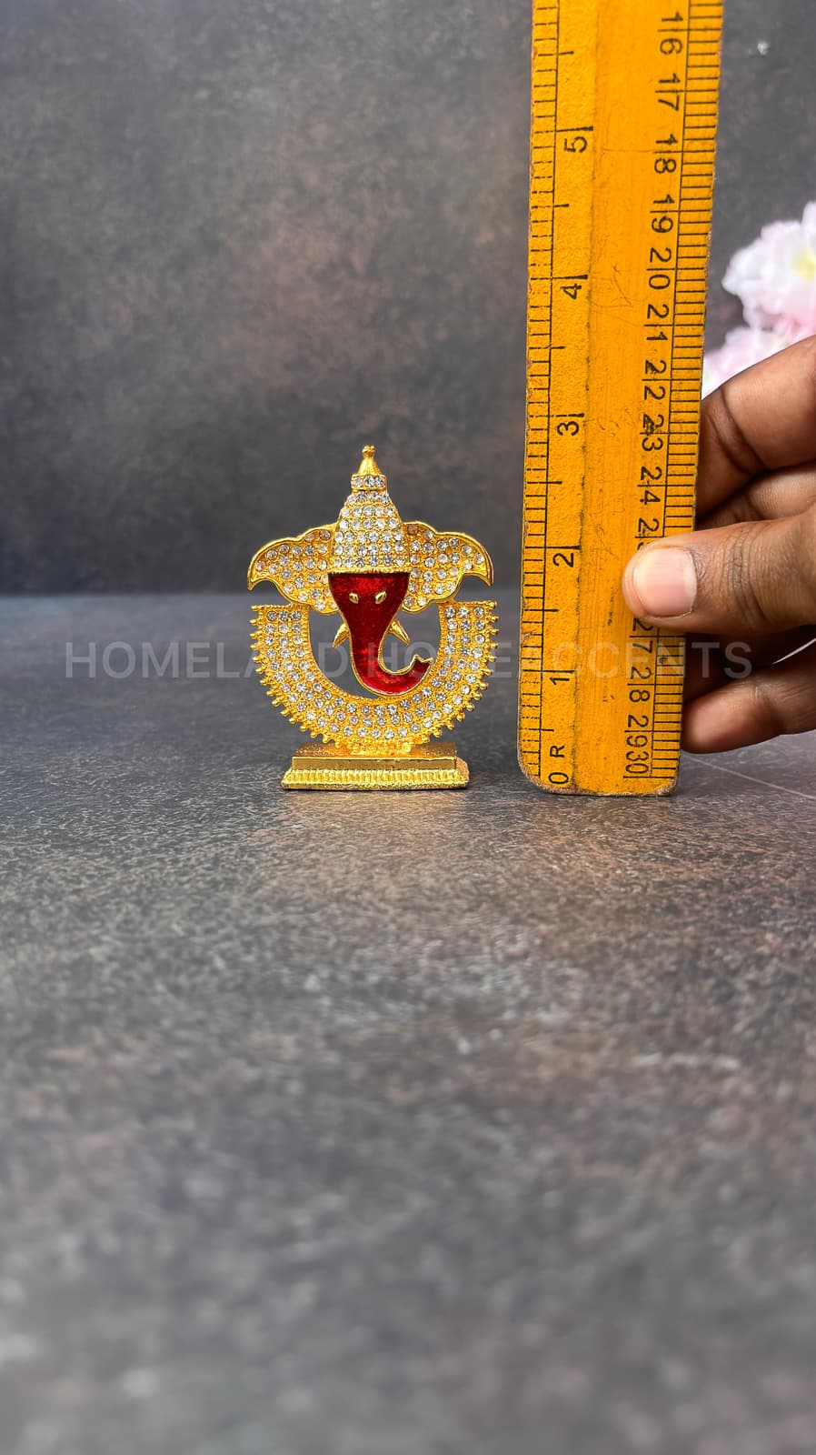 Adorn your space with this intricately designed Ganesh idol, crafted with a radiant gold-tone finish and embellished with sparkling stones. Weighing approximately 56 grams approx, this elegant piece combines spiritual significance with aesthetic appeal, making it ideal for car dashboards, work desks, or home decor. The vibrant red detailing adds a unique touch, enhancing its visual charm. This idol can also be secured using a double-sided sticker for stability, making it perfect for placement in moving spaces.