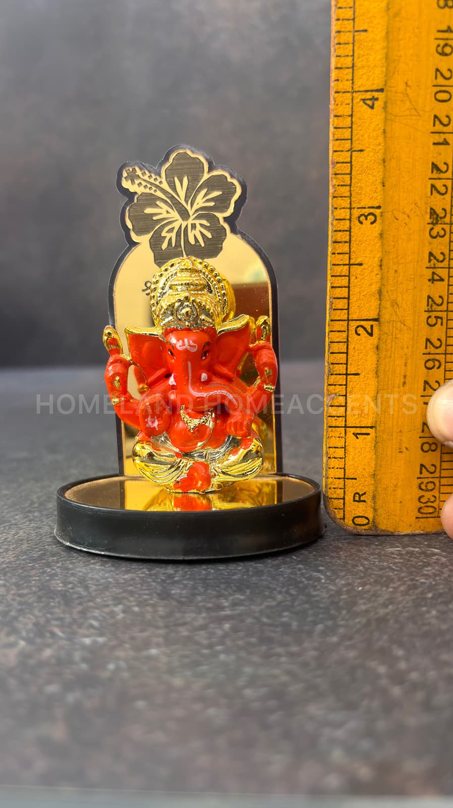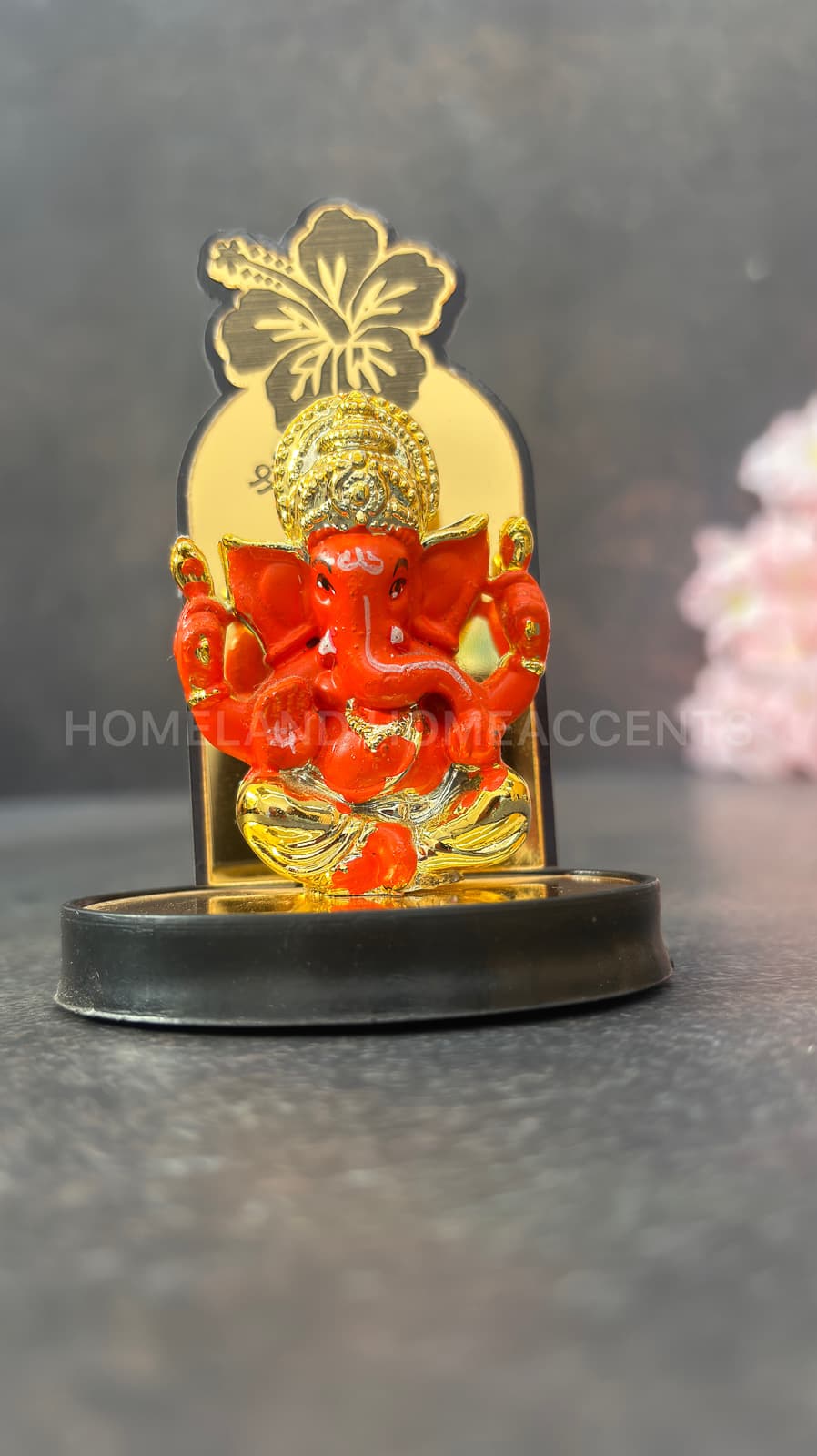 Enhance your space with this captivating Ganesh idol featuring a vibrant orange design and a golden hibiscus-themed backdrop. Crafted with precision and weighing approximately 38 grams, this lightweight and compact idol is perfect for car dashboards, work desks, or as a thoughtful gift. The detailed craftsmanship and bright colors symbolize positivity and blessings. For added convenience, this product comes with the option to securely attach it using a double-sided sticker, ensuring it stays in place wherever you need it.