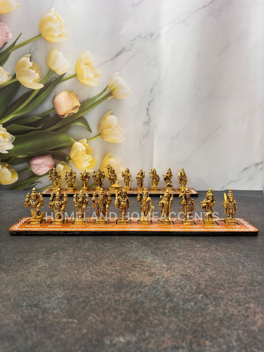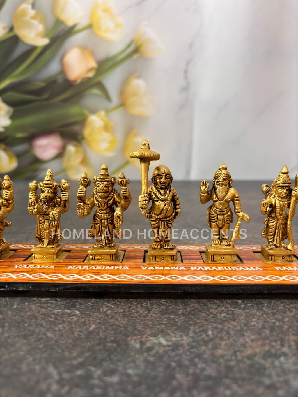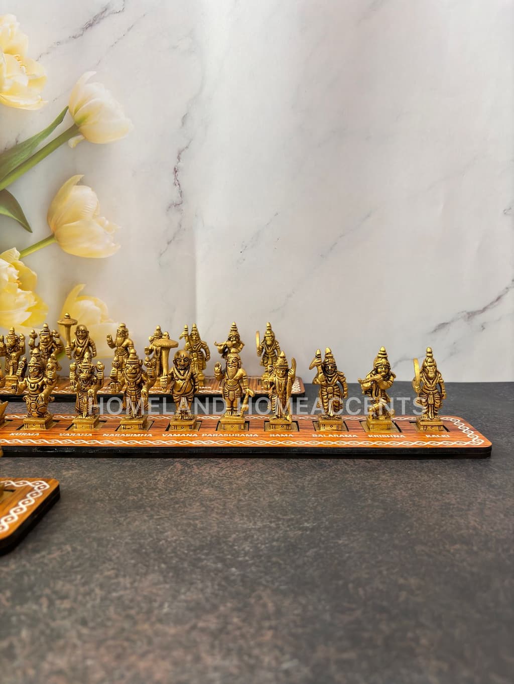 These exquisite brass statues represent the Dashavatara — the ten divine incarnations of Lord Vishnu, each symbolizing a unique aspect of his mission to restore cosmic order and protect the universe from evil. The Dashavatara is a central theme in Hindu mythology and these statues capture the essence of each incarnation with intricate detailing and craftsmanship.