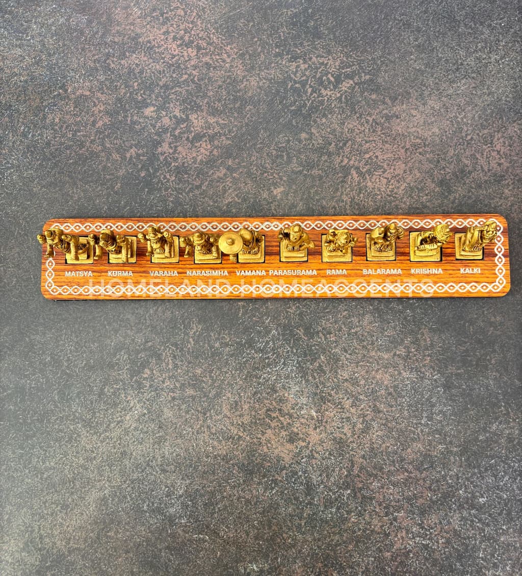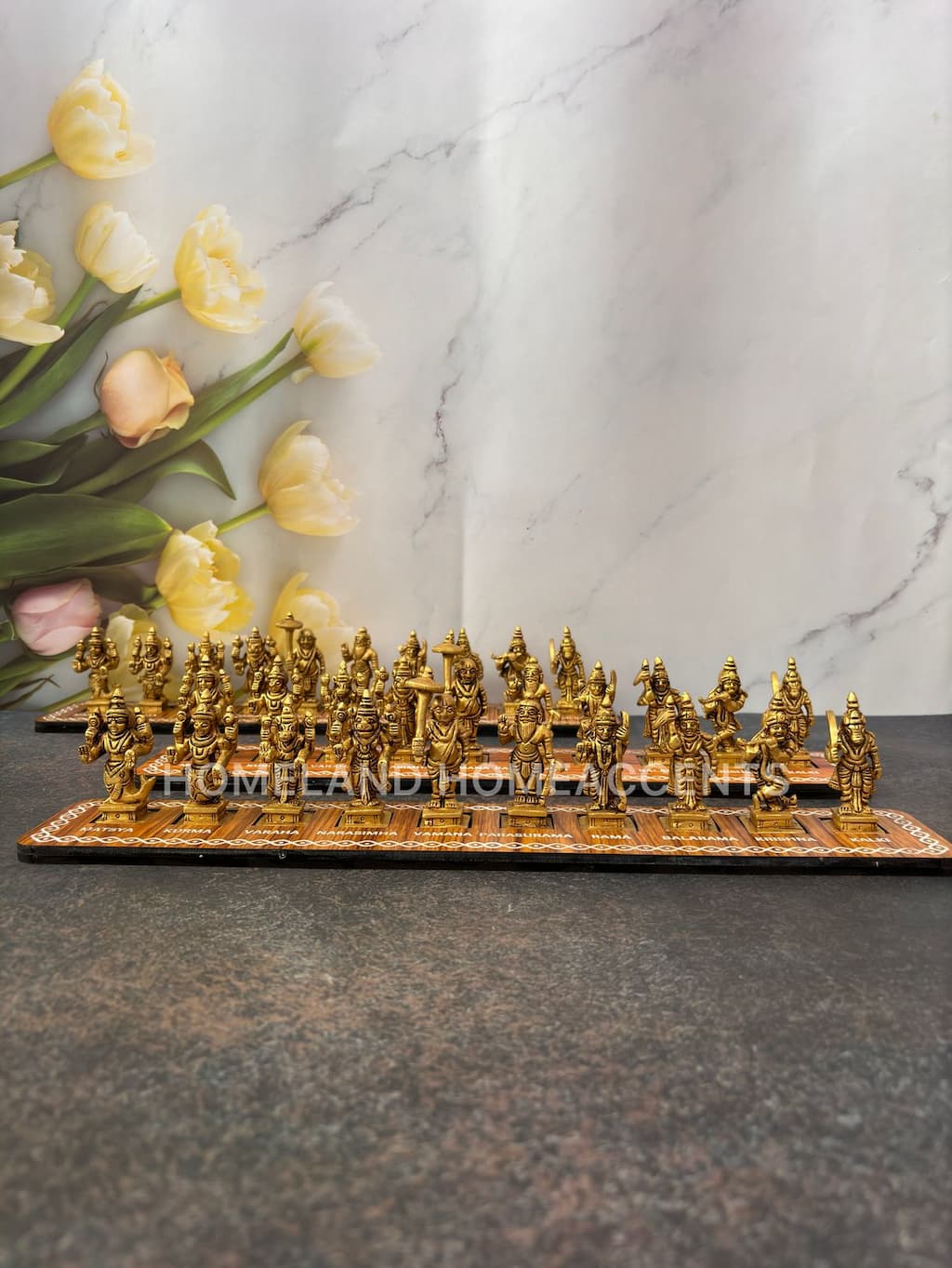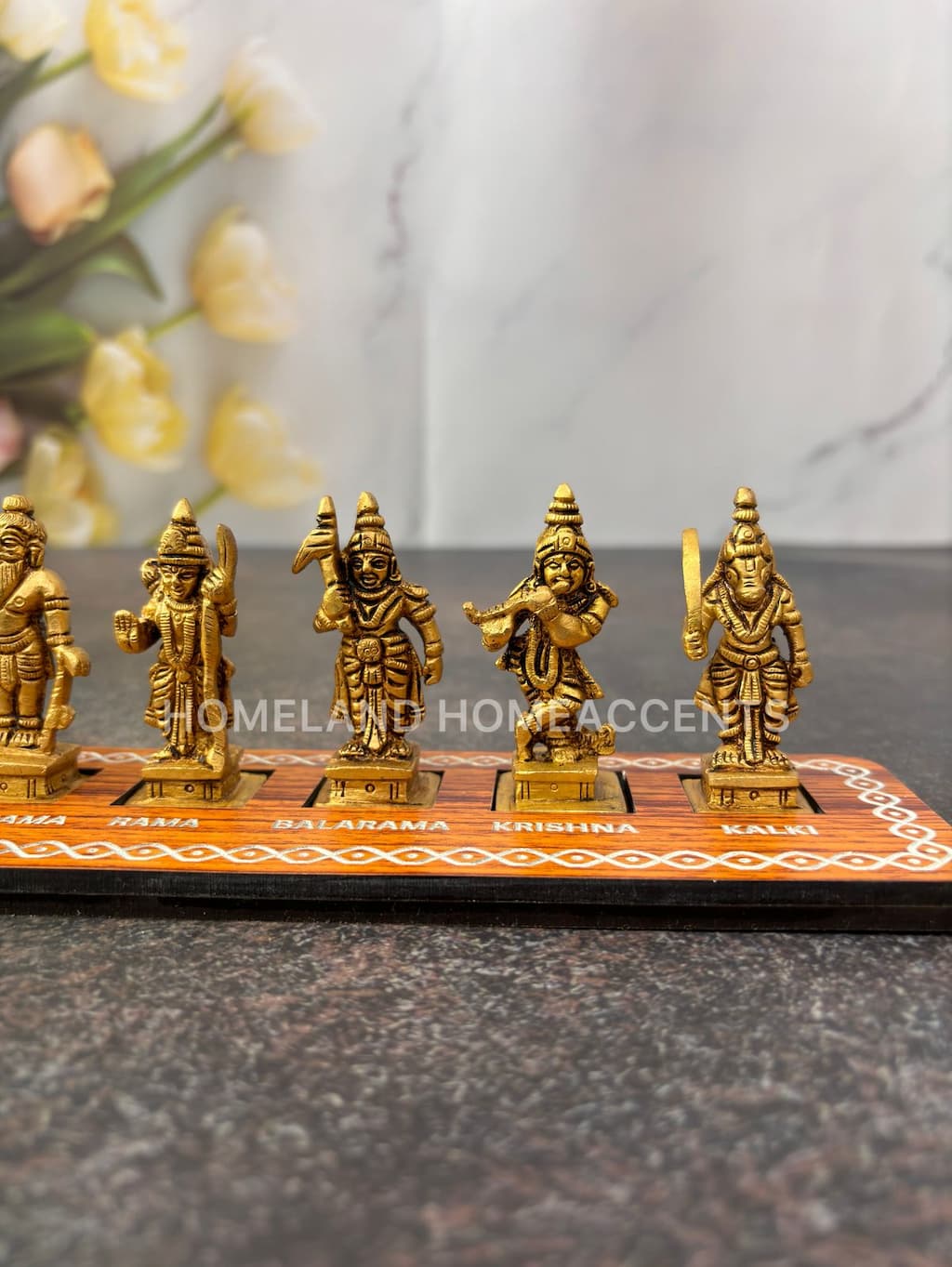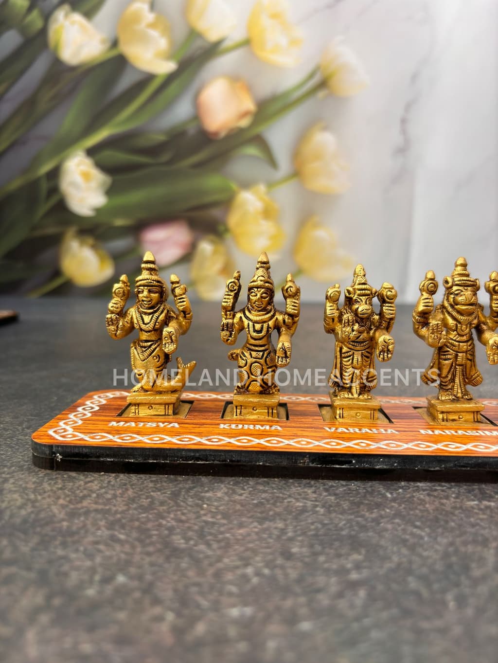 These exquisite brass statues represent the Dashavatara — the ten divine incarnations of Lord Vishnu, each symbolizing a unique aspect of his mission to restore cosmic order and protect the universe from evil. The Dashavatara is a central theme in Hindu mythology and these statues capture the essence of each incarnation with intricate detailing and craftsmanship.
