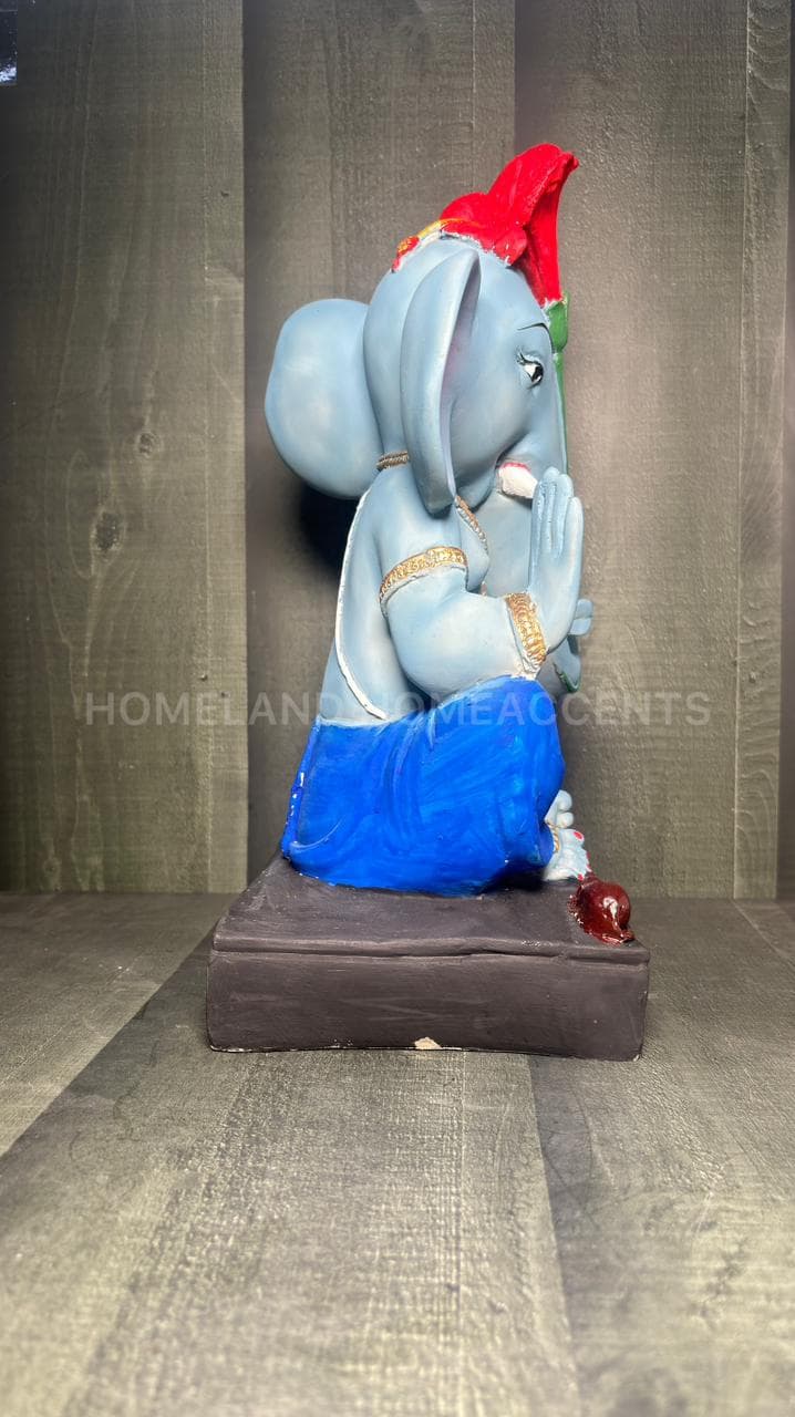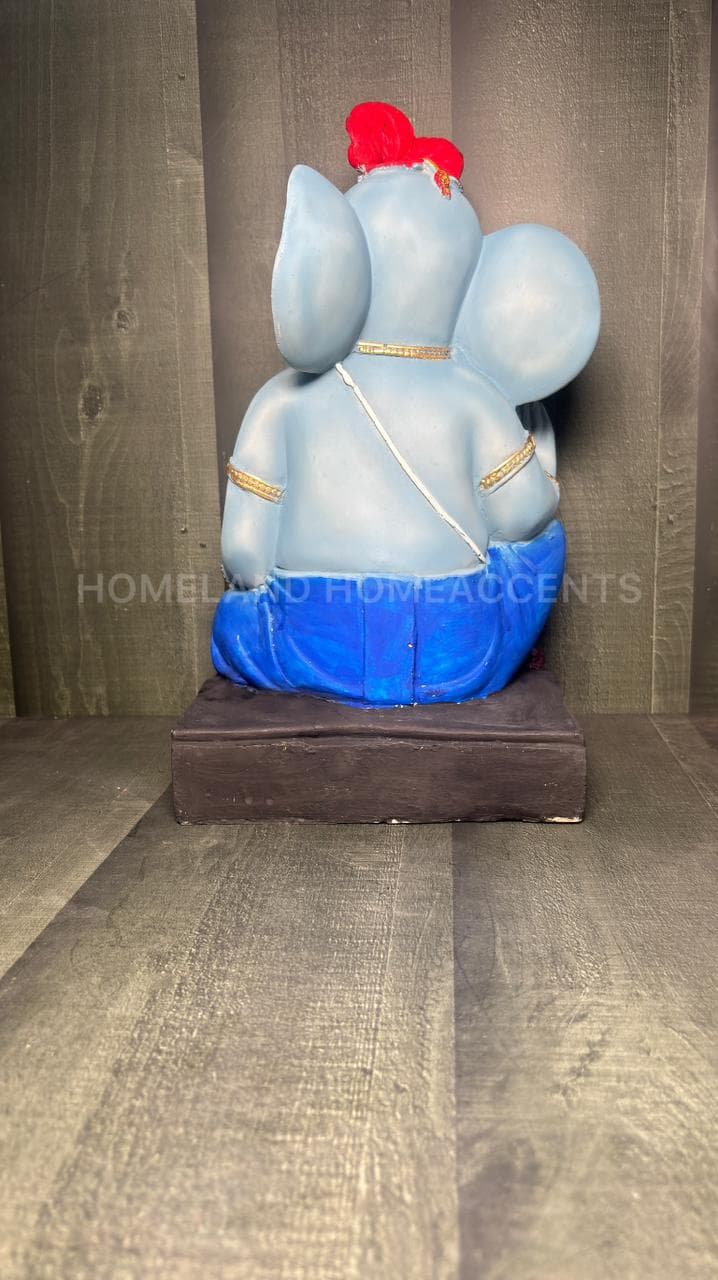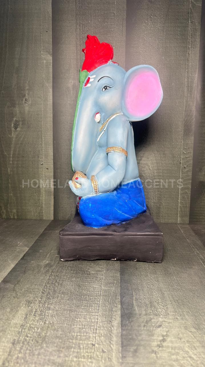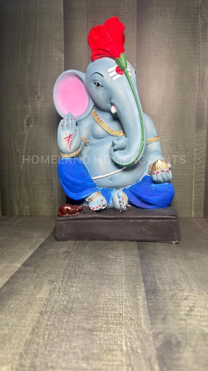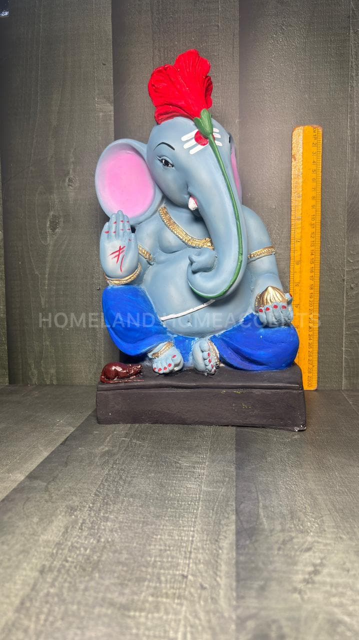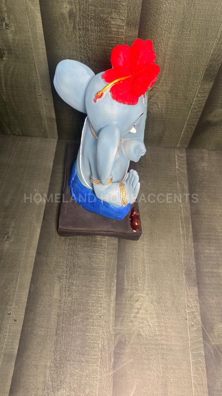 This beautifully crafted Blue Ganesha idol showcases Lord Ganesha in a serene seated posture, adorned with a vibrant red hibiscus on his head. Made from high-quality polyresin, this showpiece features intricate detailing – from the modak in his palm to his faithful mouse companion. A unique spiritual décor piece perfect for pooja rooms, festivals, or gifting.