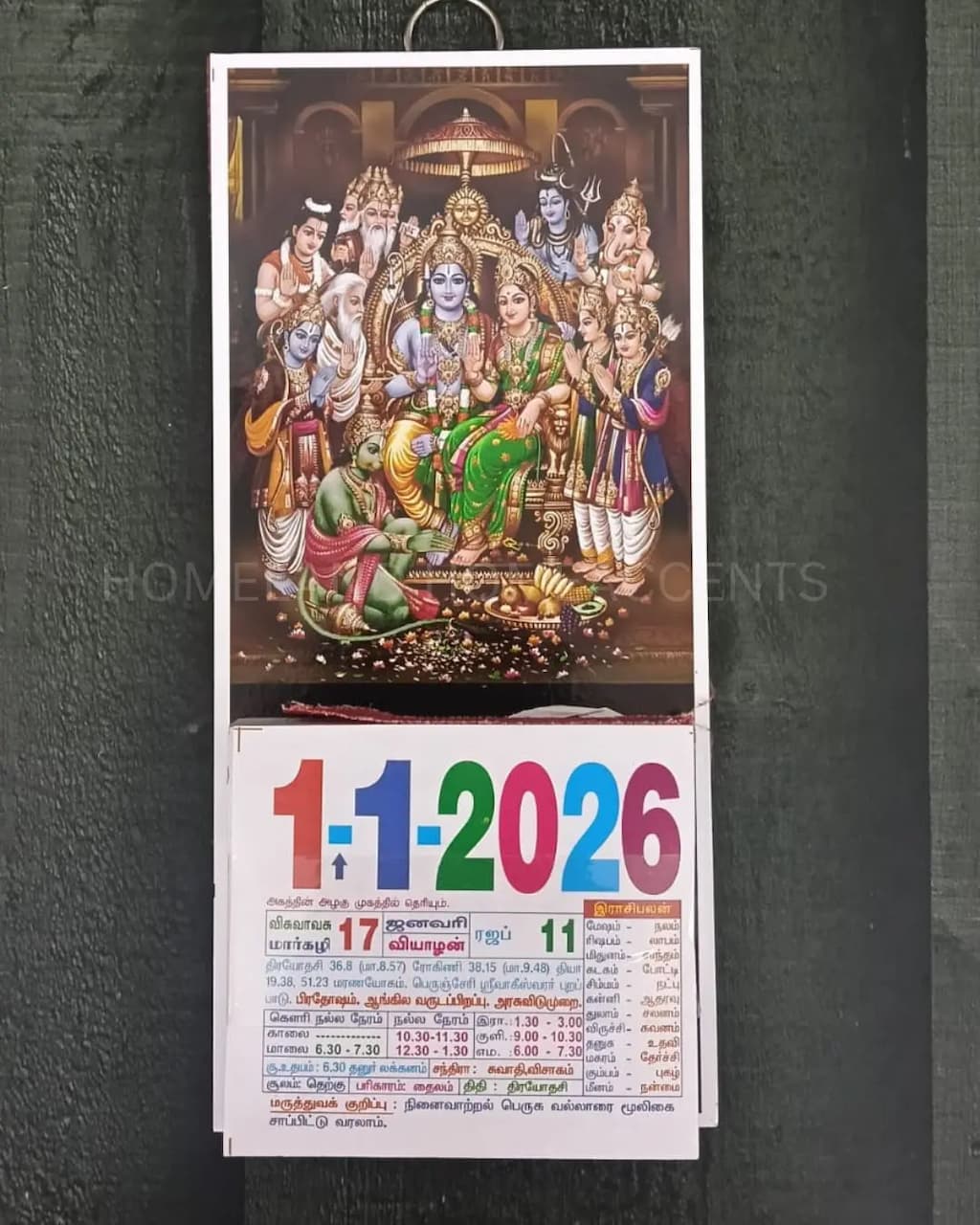 This beautifully designed Ramar Pattabisegam Mini Calendar features the divine coronation scene of Lord Rama, symbolizing righteousness, devotion, and prosperity. Compact and lightweight, it’s perfect for homes, offices, shops, vehicles, and pooja rooms. The calendar includes clear dates and festivals, making it both spiritual and practical for daily use. An ideal devotional gift for family, friends, and well-wishers, especially during New Year and festive occasions